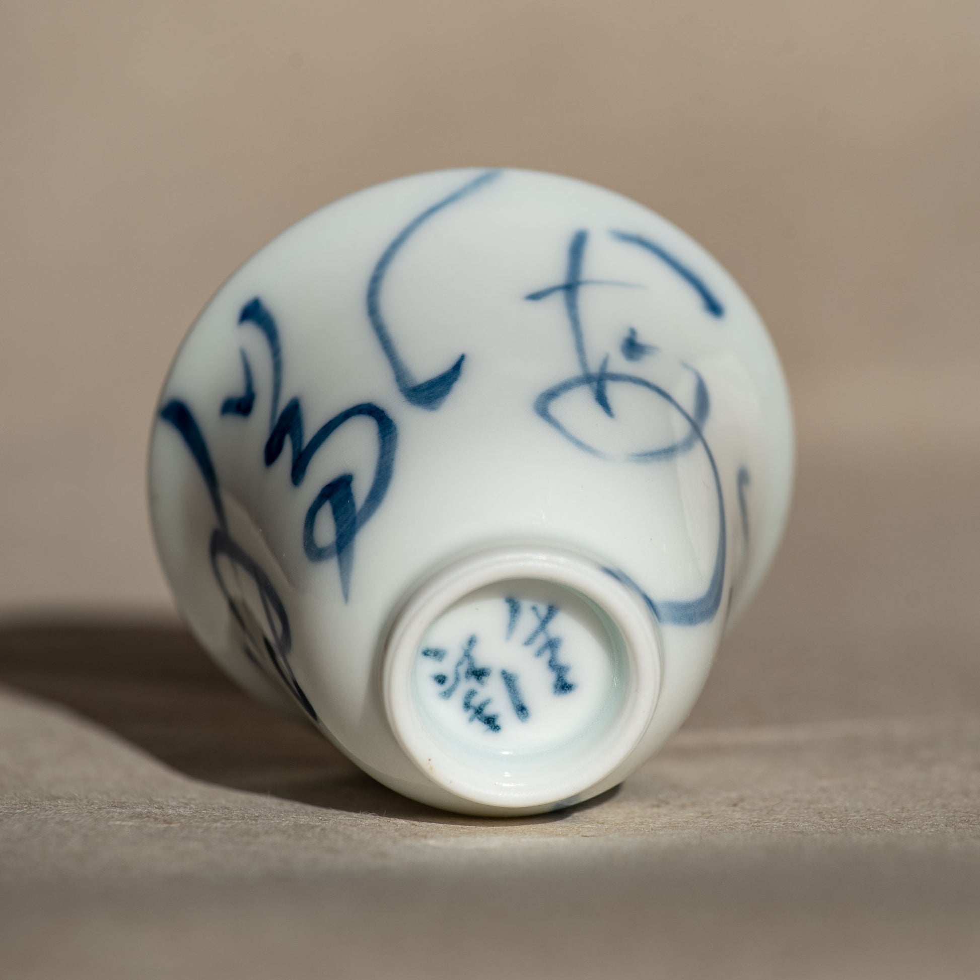 A thin cup with handwritten calligraphy. The Buddhist inscription reads ”犹水归海“, "the running water goes back to the sea".