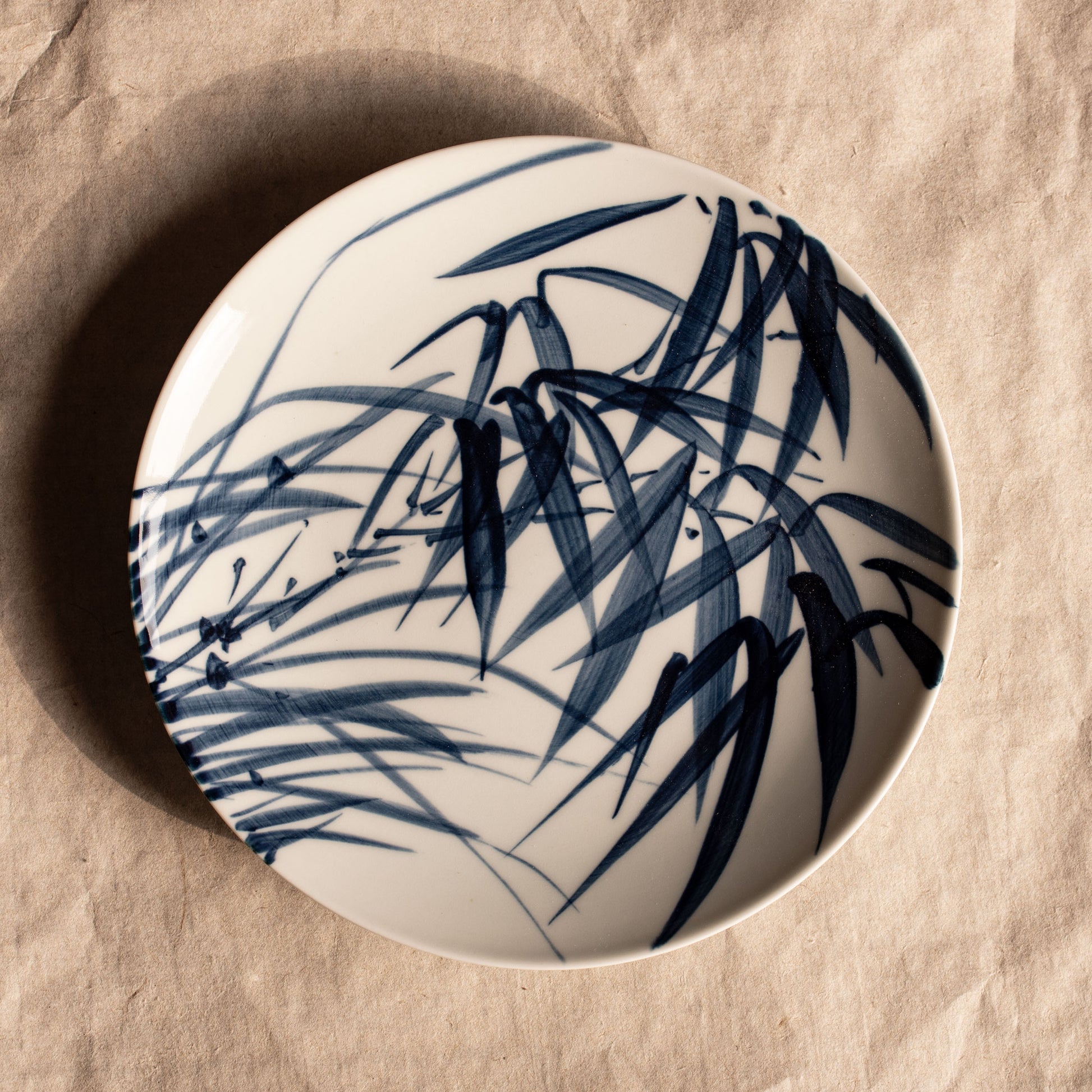 A thick, hand-painted plate with orchids and bamboo motif in the traditional literati stroke style.