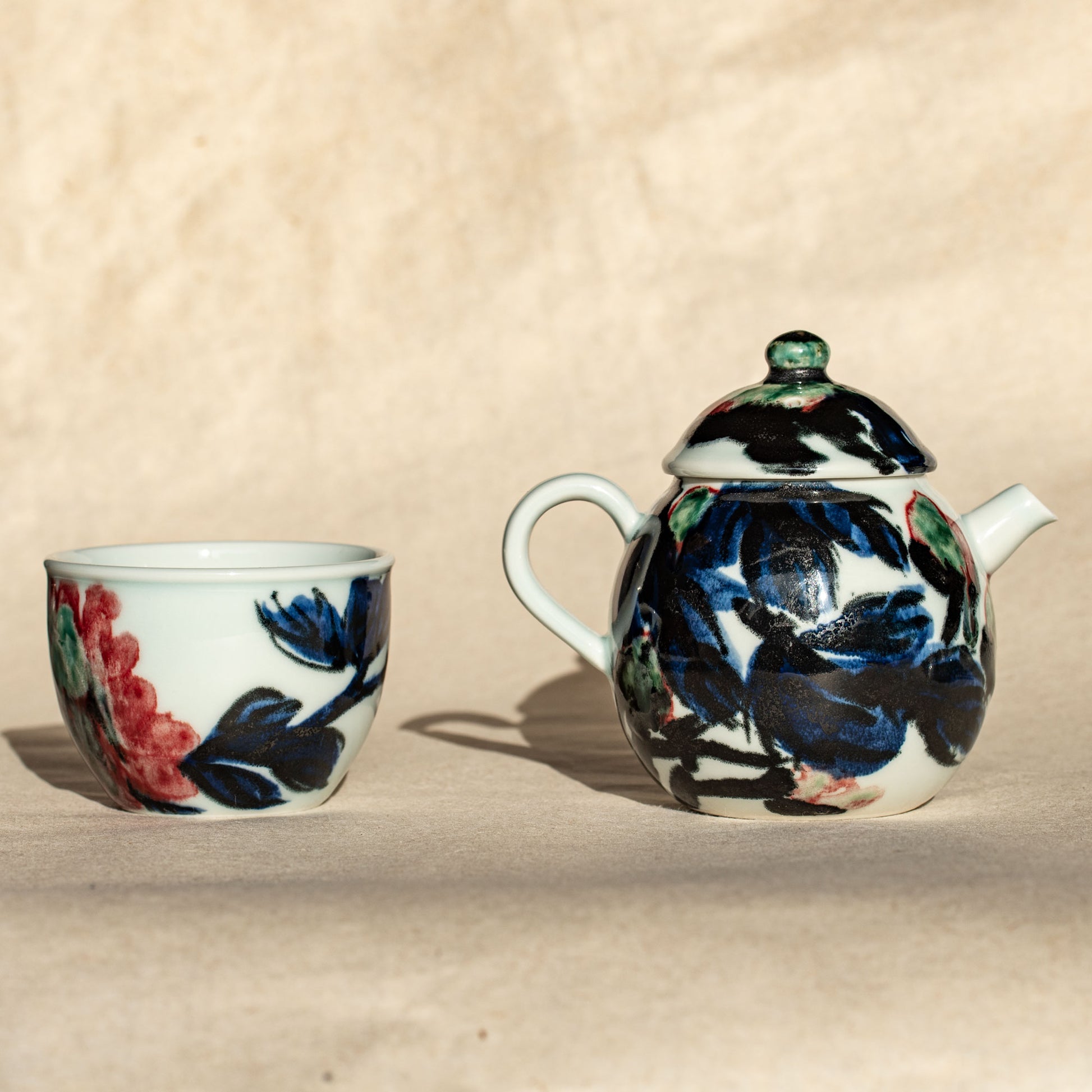 A tea set painted with a mixed technique of qinghua (inside the glaze, 釉中) and youlihong. The set consists of one pot and one matching cup.
